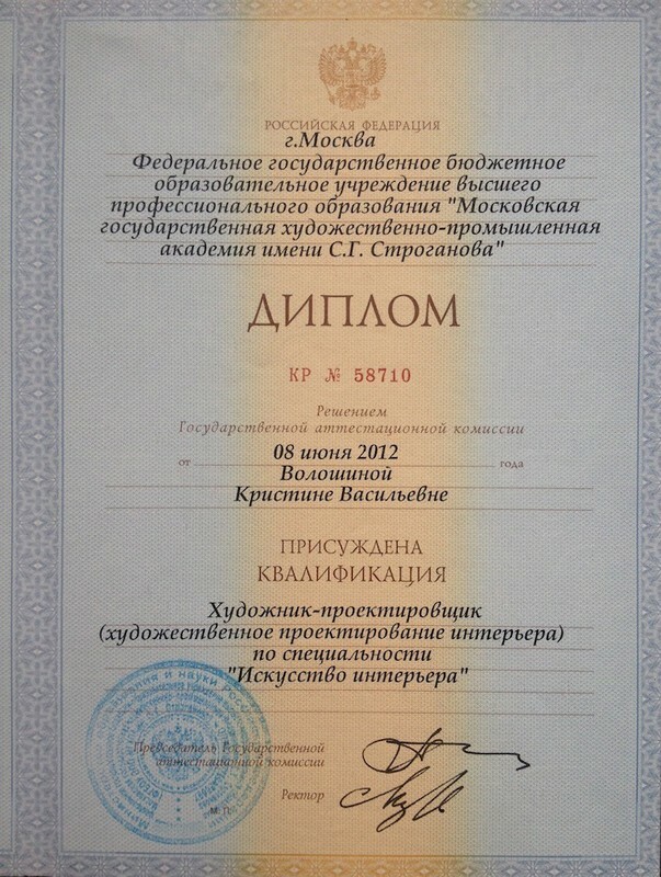 Высшее образование, квалификация "Художник-проектировщик" по специальности "Искусство интерьера"
