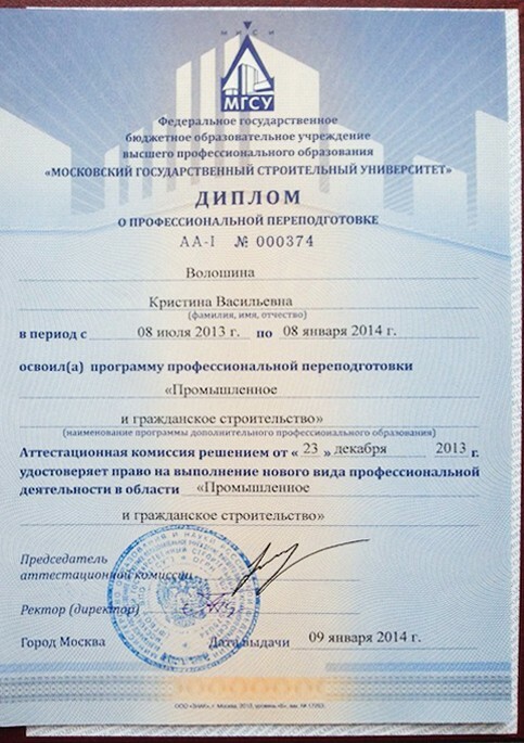 Диплом о профессиональной переподготовке "Промышленное и гражданское строительство"
